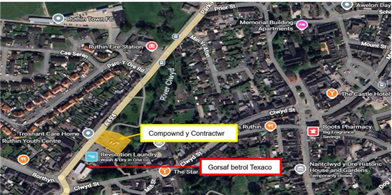 Bydd y Contractwr yn dechrau trwy sefydlu eu compownd safle o 9 Chwefror 2026. Yna bydd y gwaith yn dechrau gyda mân waith ac arolygon o 23 Chwefror, a bydd paratoadau'n cael eu gwneud ar gyfer yr ardal waith cyn i'r deunyddiau gael eu danfon ym mis Mawrth. Er mwyn helpu’r Contractwr i sefydlu’r safle yn rhwydd ac i osgoi unrhyw oedi neu ddifrod i gerbydau, gofynnwn yn garedig bod yr ardal o’r maes parcio cyhoeddus at Ffordd y Parc (a amlygwyd yn y ddelwedd isod fel Compownd y Contractwr) yn cael ei gadw’n glir o gerbydau cyn y 9fed Chwefror.