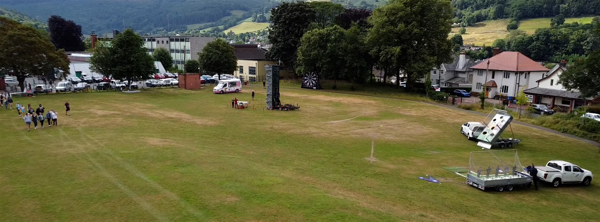 Erbyn 9am, bydd caeau pêl-droed 5 bob ochr, cwrs golff gwallgof â sawl twll a chwrs rhwystrau wedi’i lenwi ag aer wedi'u gosod yng nghanol cae'r ysgol. Ymhellach ar hyd y cae mae bwrdd dartiau enfawr wedi’i lenwi ag aer ar gyfer 'dartiau pêl-droed' (defnyddir peli pêl-droed yn lle dartiau), wal ddringo, a goliau ymarfer anelu pêl-droed a rygbi. Yn ogystal â hyn, mae cystadleuaeth tynnu rhaff, canŵio ar y gamlas gerllaw, sesiynau Just Dance a digwyddiadau mwy traddodiadol fel rasys rhedeg (100m, 400m) a thaflu pwysau.