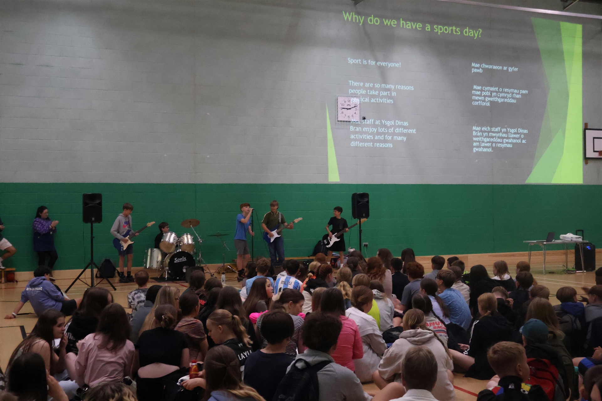Band a ffurfiwyd gan ddisgyblion yn chwarae yn y cyflwyniad