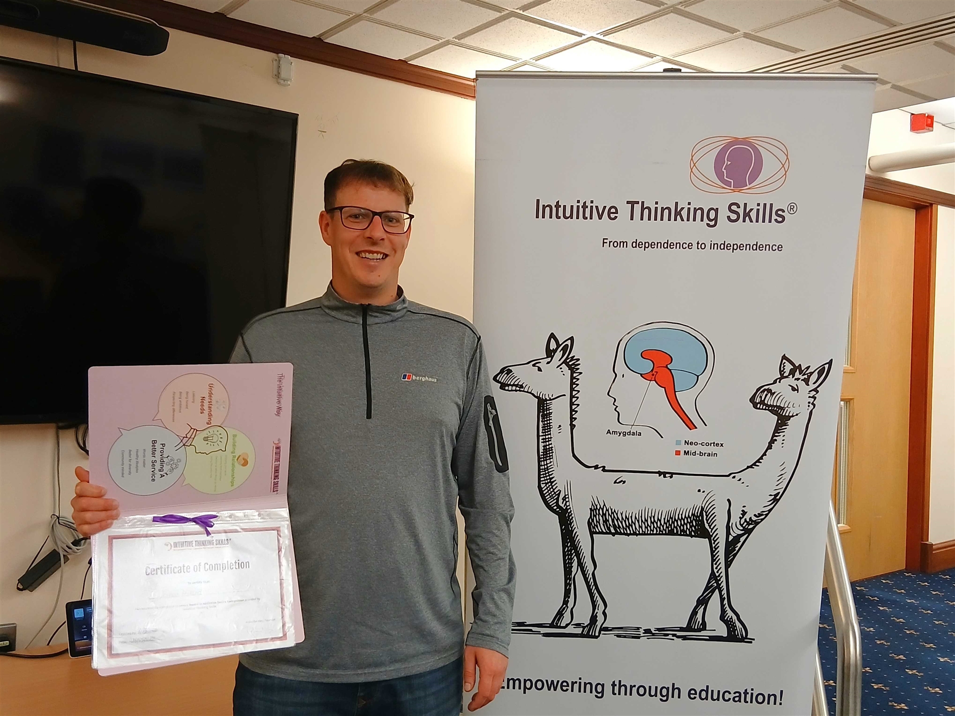 Mae Josh nawr wedi graddio o’r cyrsiau Intuitive Thinking gyda nifer o dystysgrifau, ac mae’n mwynhau ei rôl newydd yn y sector ynni.