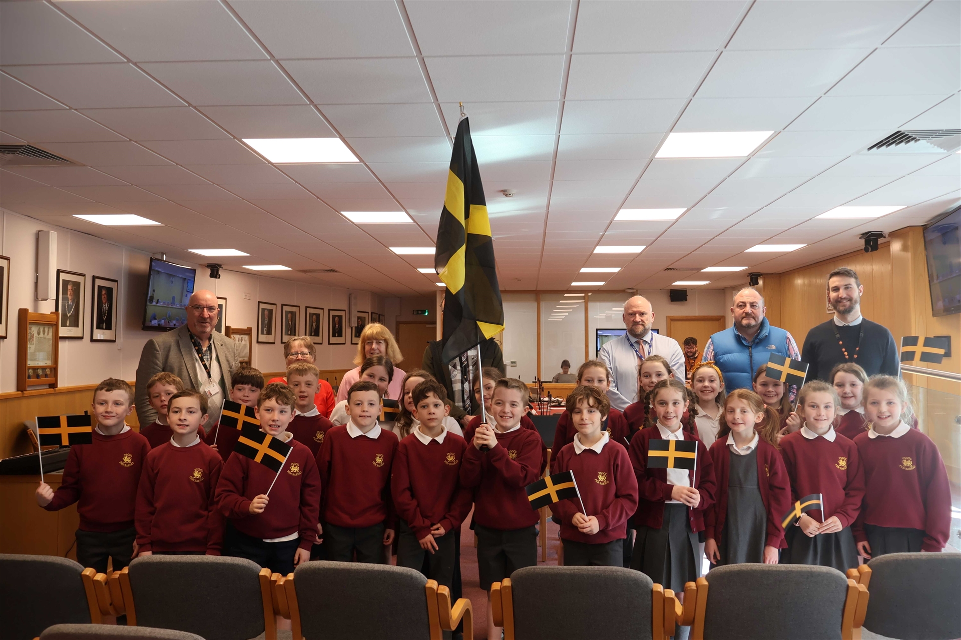 Ysgolion yn canu yn Siambr y Cyngor fel rhan o ddathliad Dydd Gŵyl Dewi