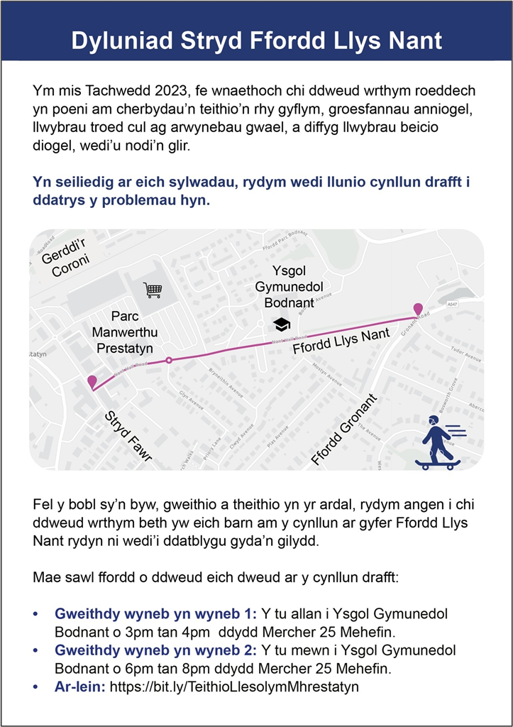 Dywedwch Eich Dweud ar Ddyluniad Stryd Teithio Lesol Ffordd Llys Nant