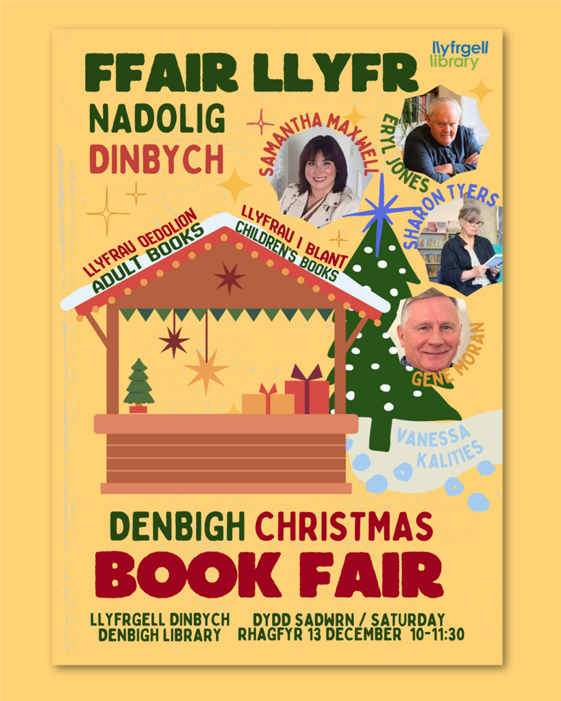 Mae Llyfrgelloedd Sir Ddinbych yn falch o groesawu rhestr wych o awduron lleol i Lyfrgell Dinbych ar ddydd Sadwrn 13 Rhagfyr rhwng 10am a 11.30am ar gyfer Ffair Lyfrau Nadolig.