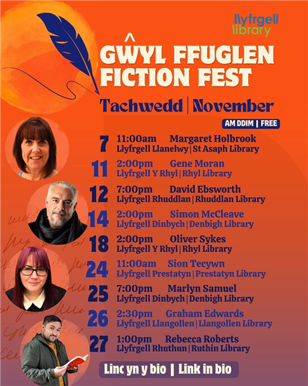 Yr hydref hwn mae gan Lyfrgelloedd Sir Ddinbych restr wych o awduron i oleuo'r dyddiau tywyll. Pan mae hi'n oer y tu allan, beth allai fod yn well na chyrlio i fyny gyda llyfr da, ond os oes angen rhywfaint o ysbrydoliaeth arnoch ar gyfer eich darlleniad nesaf, beth am ymuno â ni yn ein digwyddiadau am ddim?