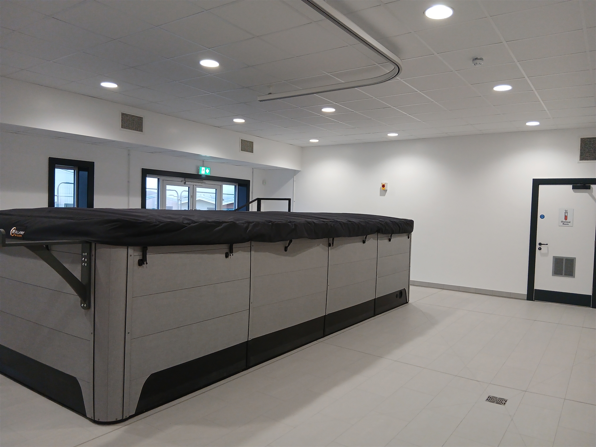 Gosodwyd y pwll ei hun ym mis Hydref, yn ogystal â ffenestri a drysau ar y safle, gyda chwblhad ystafell ymolchi a chyfleusterau newid hefyd. Mae’r prif elfennau mewnol wedi cael eu cwblhau, gyda’r drysau mewnol wedi cael eu gosod, ac ystafell y pwll ac adrannau o’r cyntedd wedi eu paentio.