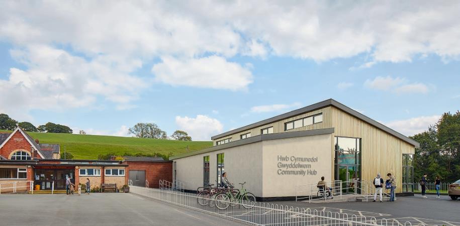 The project, which is located on the site of Ysgol Bro Elwern will deliver a new classroom, kitchen and ancillary spaces for the school alongside the new community hub.