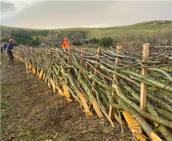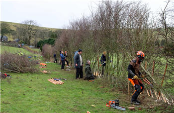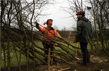 They carry out the traditional skill to rejuvenate the hedgerows by partially cutting and laying the stems at an angle to encourage regrowth and fill gaps in the hedge.