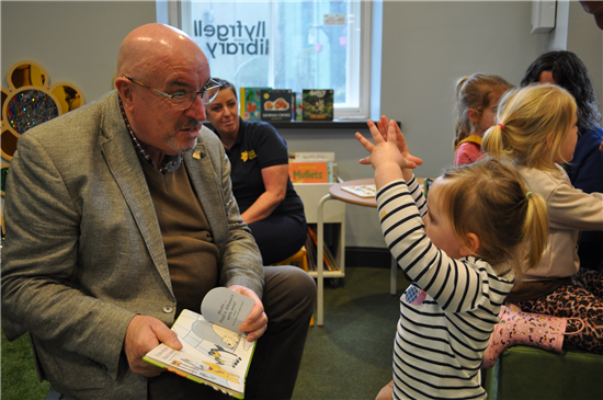 Councillor Emrys Wynne being thoroughly entertained by one of the young readers!