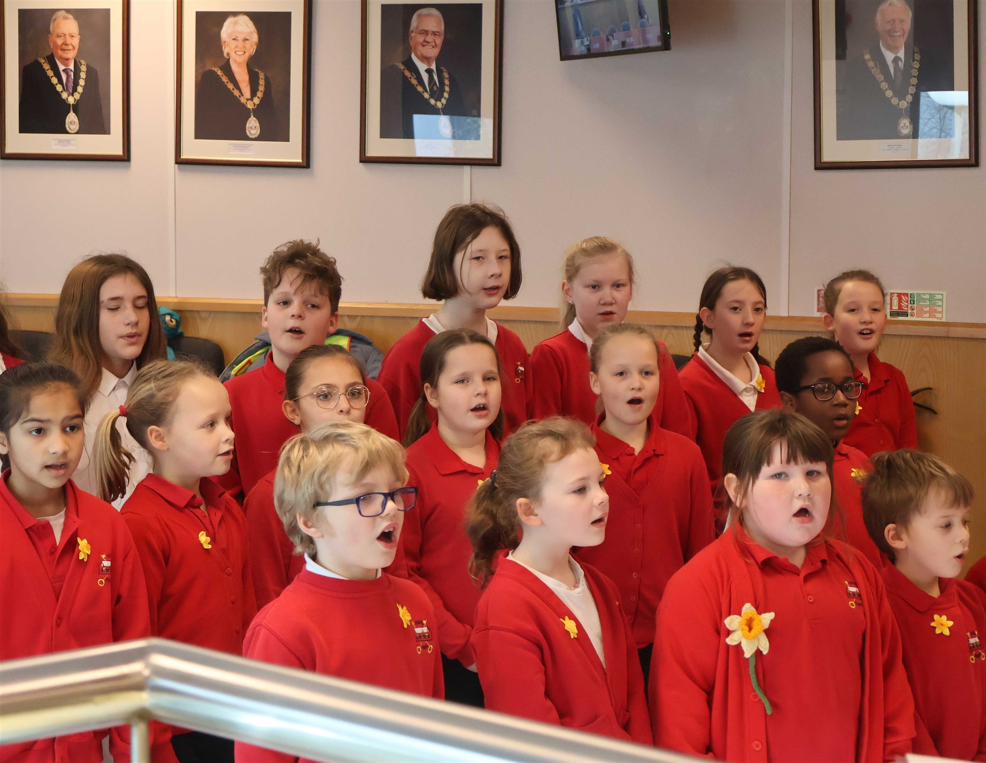 As part of St David’s Day celebrations this year, local schools from Ruthin were invited to the Council Chamber to sing in front of the Welsh Language Steering Committee.