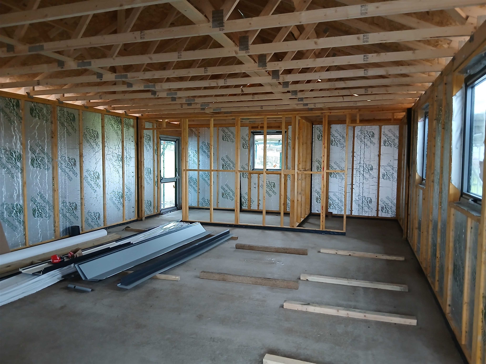The community cabin build at Ysgol Cefn Meiriadog is nearing completion, with the main structure now in place and wall insulation installed.